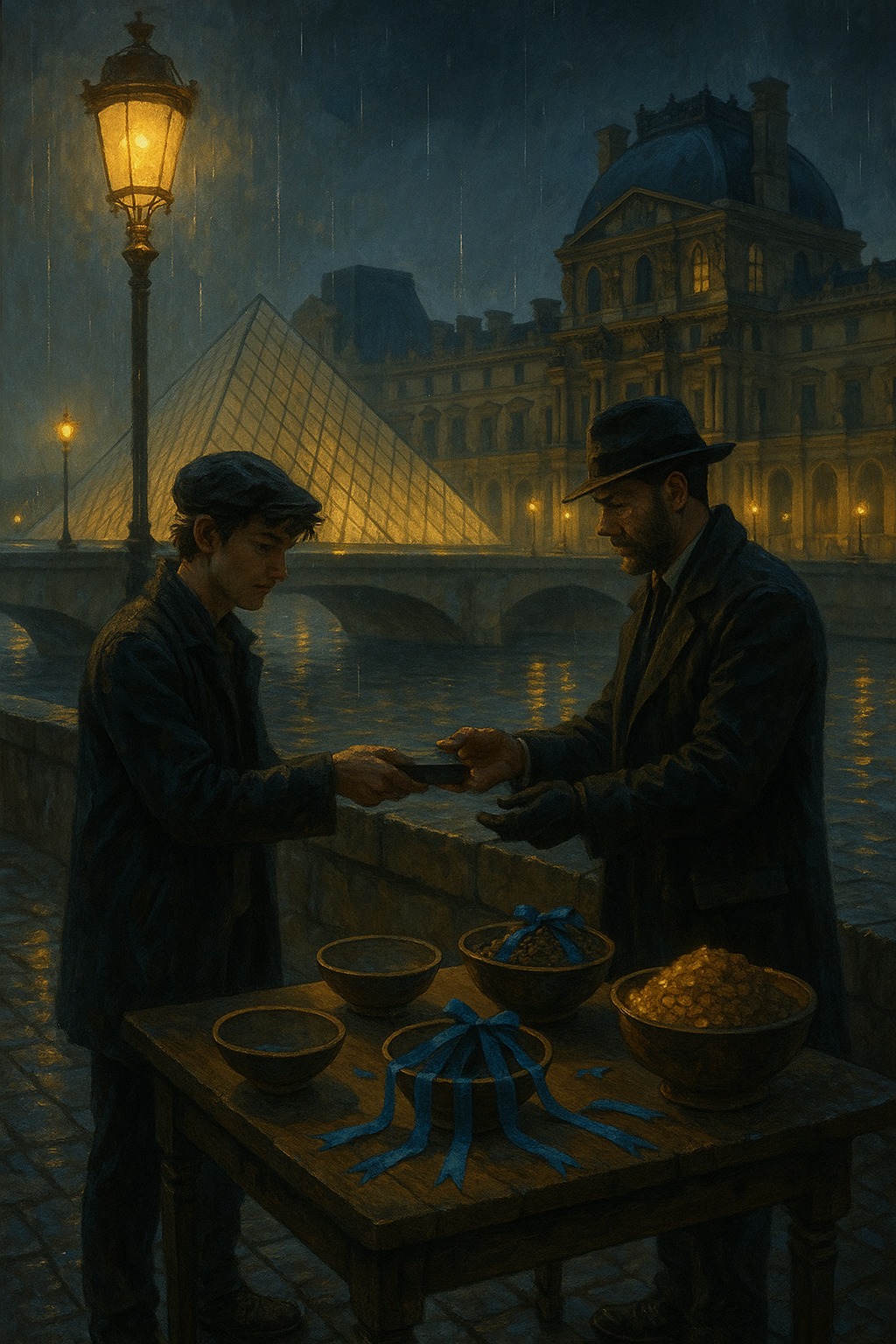 Când s-a luminat de ziuă, Parisul s-a trezit fără o bijuterie, dar mai bogat cu o poveste. Ciprian dispăruse, iar în fața muzeului a rămas doar un bilet, scris cu cerneală albastră: