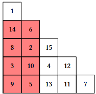 Formally, the storage has the shape of a triangle half-matrix, the one located below the main diagonal (including the main diagonal), in which each element represents a number of nuts. The numbers in this half-matrix are the numbers from 11 to N×(N+1)2\frac{N \times (N + 1)}{2}, with each number appearing exactly once.