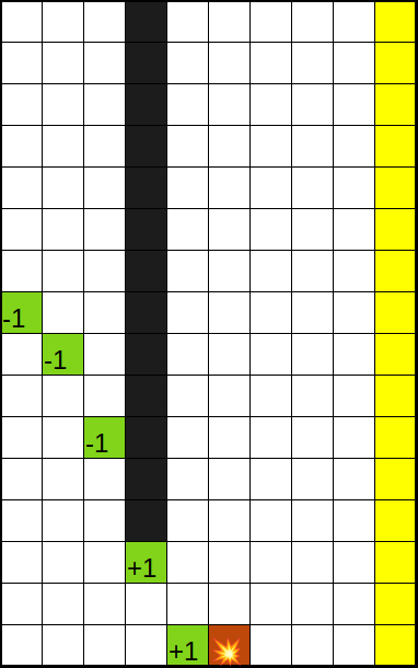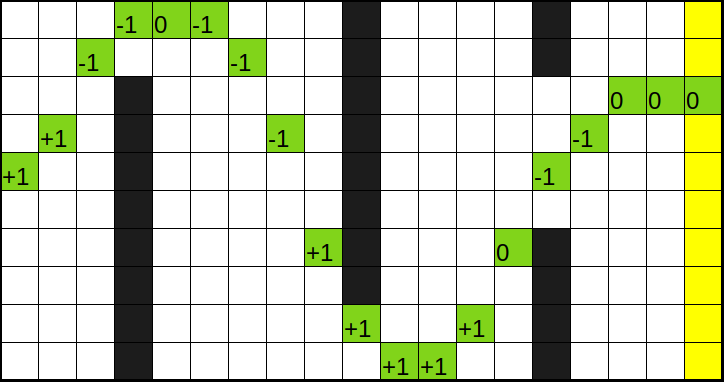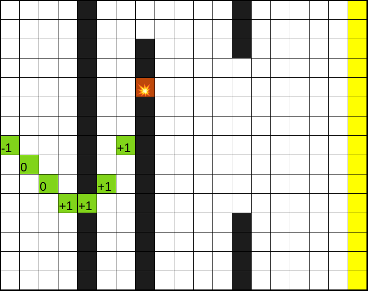 the figure. Visited cells are colored in green, with , and representing the vertical speed changes