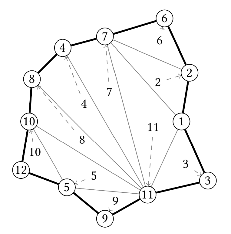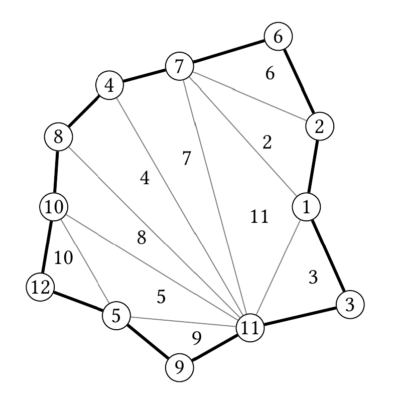 Little Polygon received a gift from his wonderful friend Little Circle. In the gift there was a drawing of an vertex polygon, each vertex being labeled with an integer from to , and a triangulation of it, e.g: