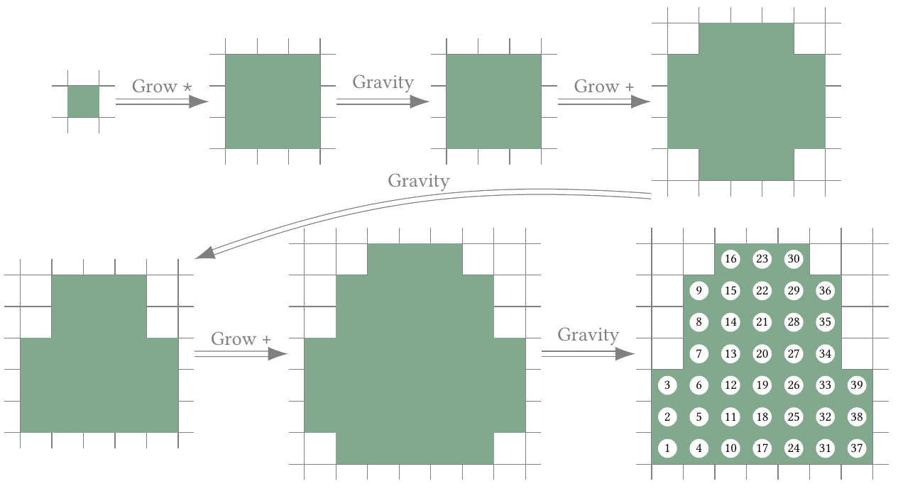 - Grow phase: Around each square in this shape some new squares will appear. The grow phase can be of two types: