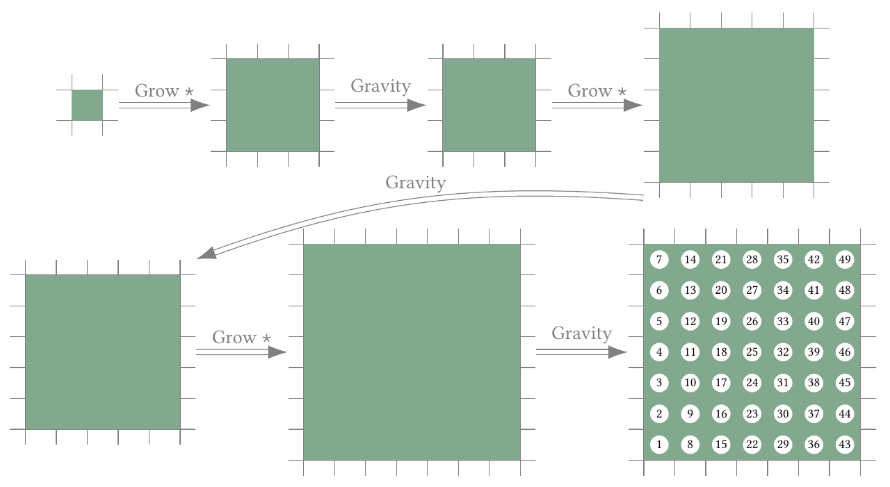 - : Suppose Little Newton starts with a shape made out of only one square and applies, for , in order, a grow phase of type followed by a gravity phase. How many squares will the shape have in the end?