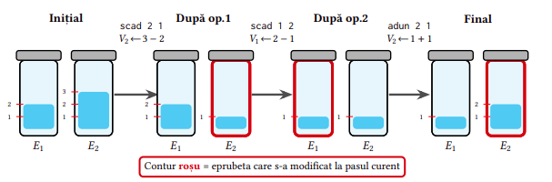 - La fiecare operație, doar eprubeta cu indicele își modifică valoarea. Eprubeta cu indicele rămâne neschimbată.