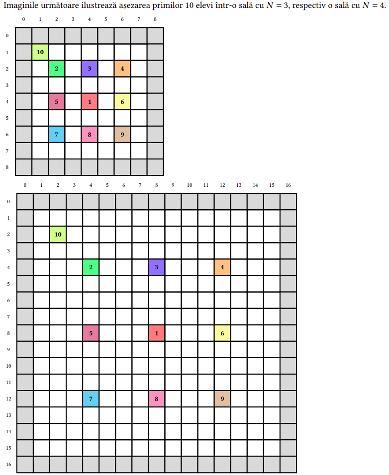 În acest an, așezarea elevilor în bănci se face într-un mod mai special. Elevii intră în sală pe rând pentru a susține proba și se așază în bănci exact în ordinea în care intră. Când un elev intră în sală, analizează fiecare bancă neocupată, pentru a determina cea mai mică dintre distanțele de la aceasta până la fiecare bancă ocupată (fie de un supraveghetor, fie de alt elev). Apoi se așază într-o bancă neocupată pentru care această distanță este maximă. Dacă există mai multe bănci neocupate care respectă această condiție, elevul trebuie să se așeze în prima, adică cea care este situată pe linia cu numărul cel mai mic, iar în caz de egalitate a liniilor, cea situată pe coloana cu numărul cel mai mic.