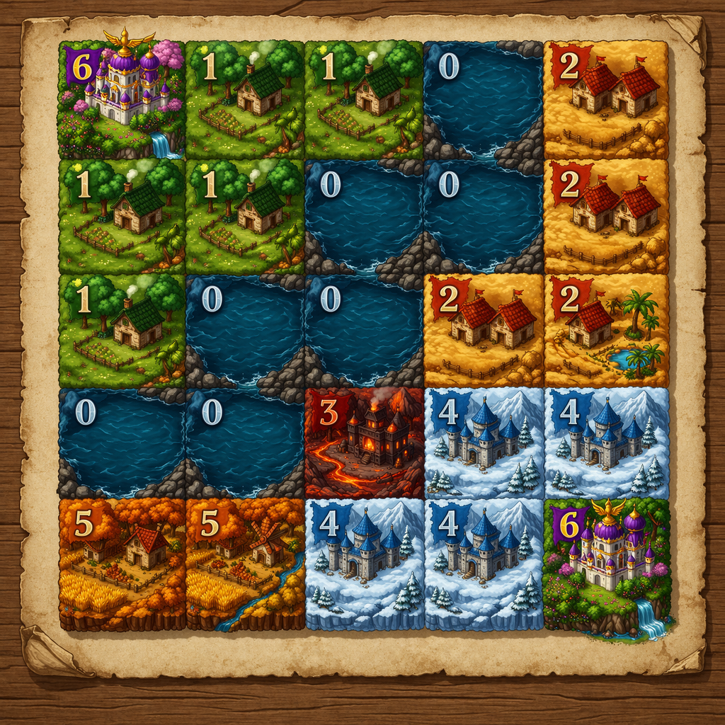 Tărâmul este reprezentat printr-o matrice cu linii și coloane. Fiecare celulă a sa conține: