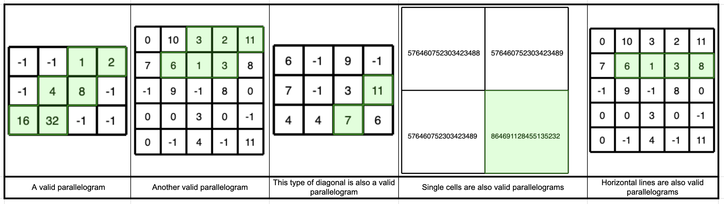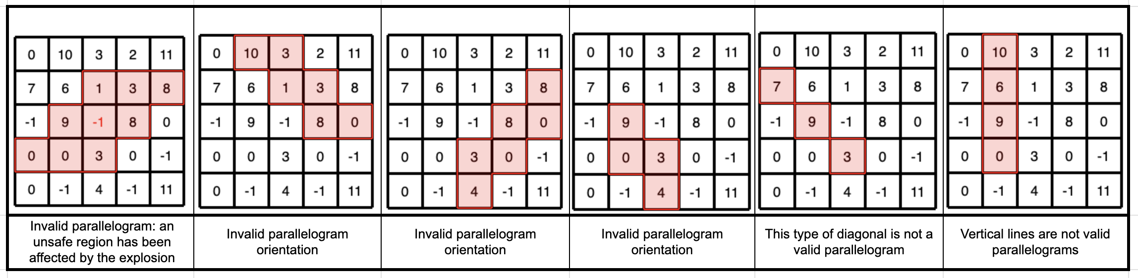 The vein can be represented as an matrix , where denotes the amount of bitrock ore in that particular region of the vein. However, the Parallelogram Mining Company decided that Gaudeamus must avoid mining in some regions (due to safety concerns). For those regions, .