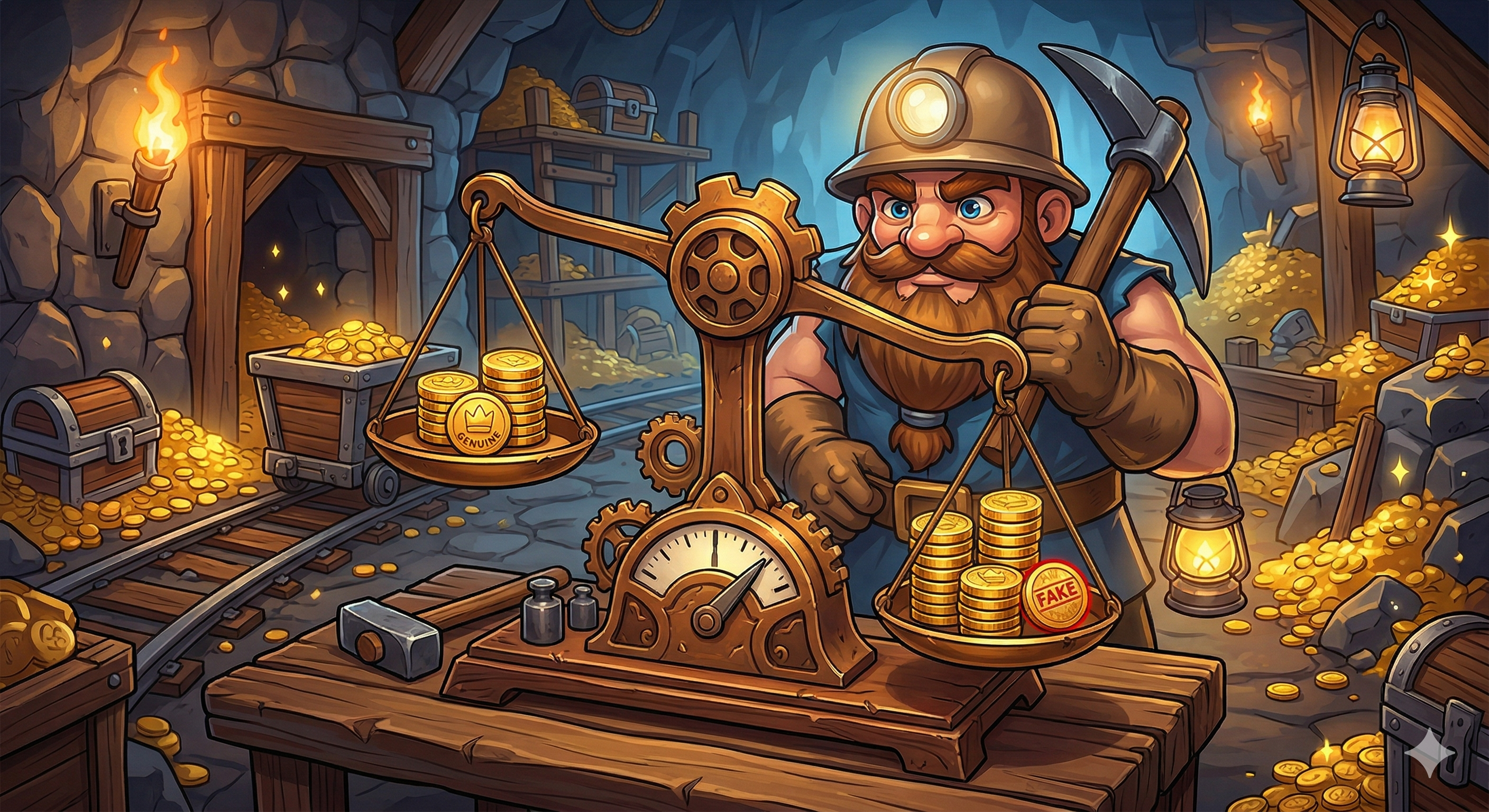 After an exhausting day of grueling work, Gaudeamus the miner finally leaves the Bandit's mine. For his hard labor, the Bandit pays him with exactly identical-looking coins. However, the miner is no stranger to the Bandit's tricks. From his past experiences, he knows for a fact that exactly one coin in his wage is a fake!
