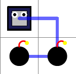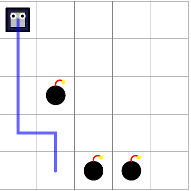 The blue line shows the path of the robot. By placing the bombs like in the figure, the robot can make move before stepping on a bomb.